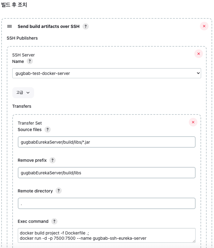 - 빌드 후 조치 -> Send build artifacts over SSH 설정 추가