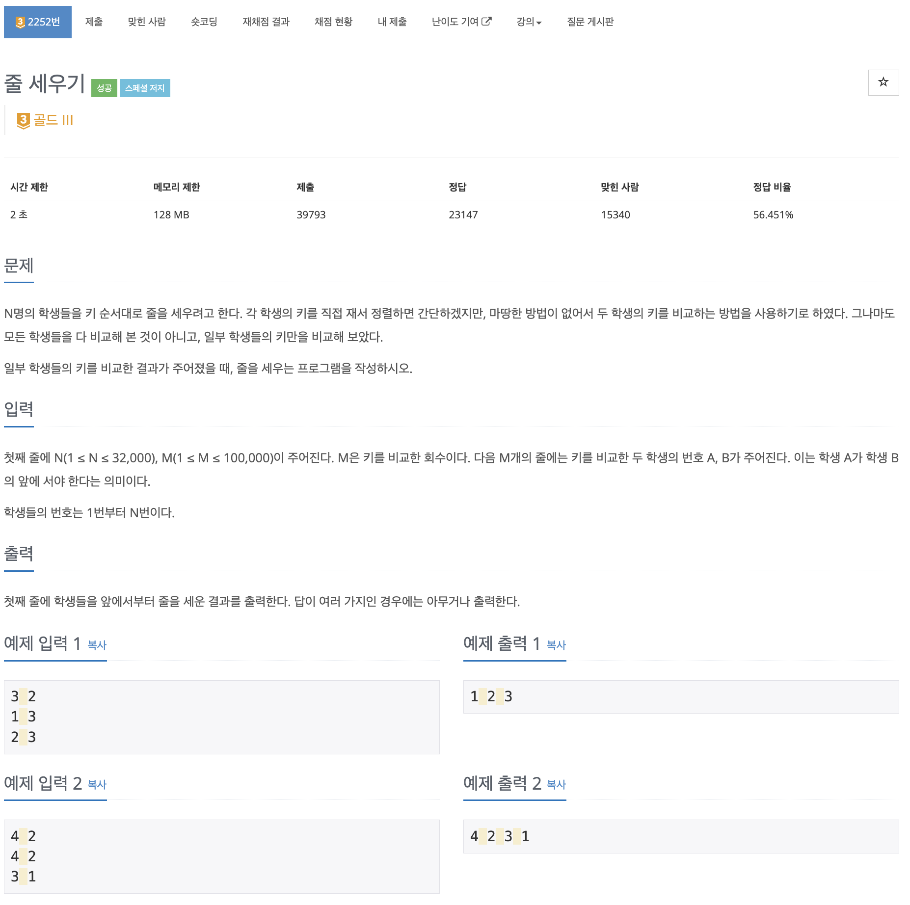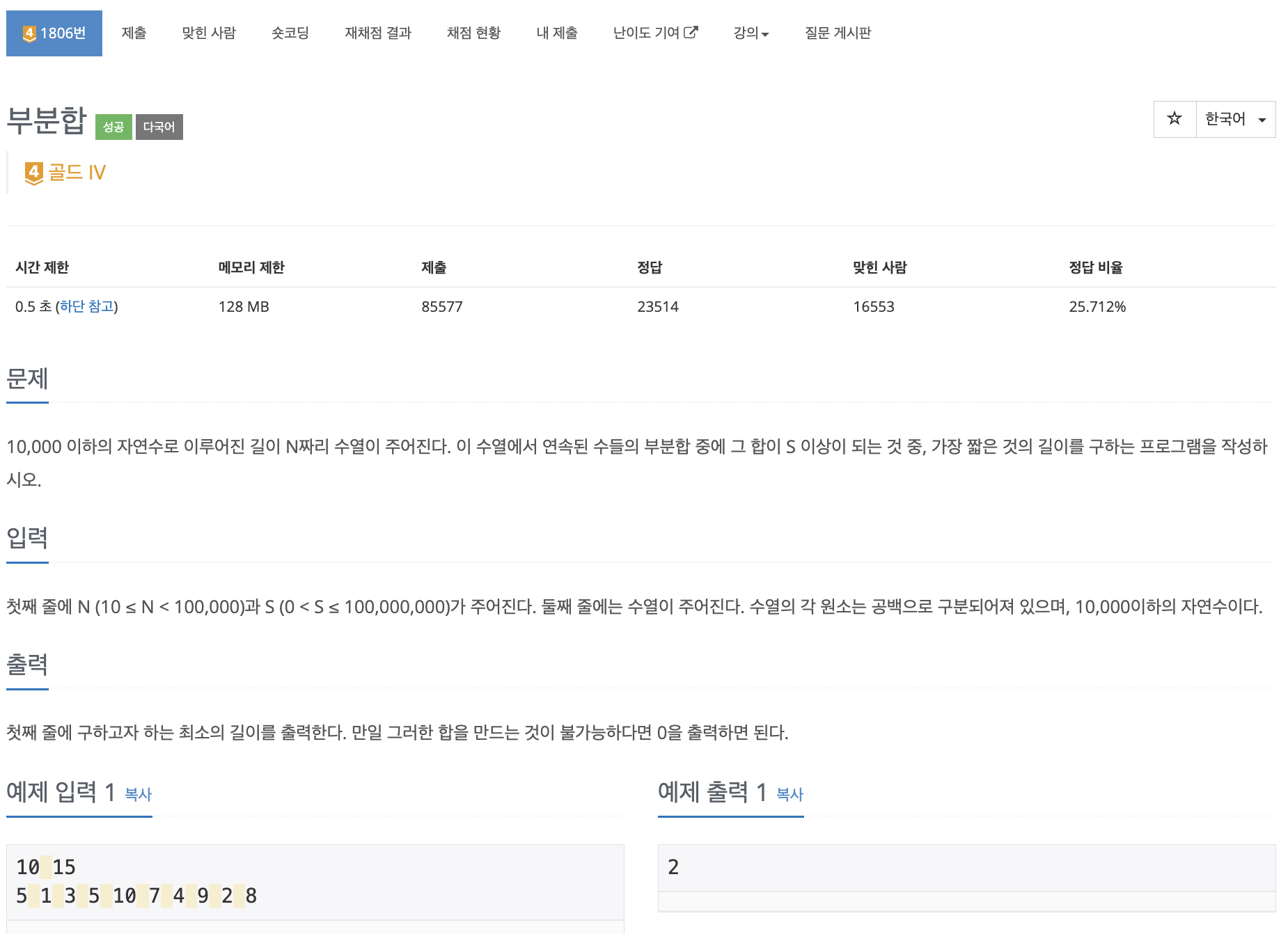 백준-1806 : 부분합 https://www.acmicpc.net/problem/1806 1806번: 부분합 첫째 줄에 N (10 ≤ N < 100,000)과 S (0 < S ≤ 100,000,000)가 주어진다. 둘째 줄에는 수열이 주어진다. 수열의 각 원소는 공백으로 구분되어져 있으며, 10,000이하의 자연수이다. www.acmicpc.net 풀의 입력 받은 값의 구간합 배열을 만든다. 투포인터를 이용하여 왼쪽은 구간합 시작점 오른쪽은 구간합의 끝점으로 사용한다. 구간합의 값이 S 보다 작을 경우 오른쪽 포인터를 이동 목표 합 보다 크고 길이가 짧은 경우 정답을 갱신 구간합의 값이 S 보다 클 경우 왼쪽 포인터를 이동 한다. 구간 합을 못찾을 경우 0을 반환 코드 (Python) import sy..